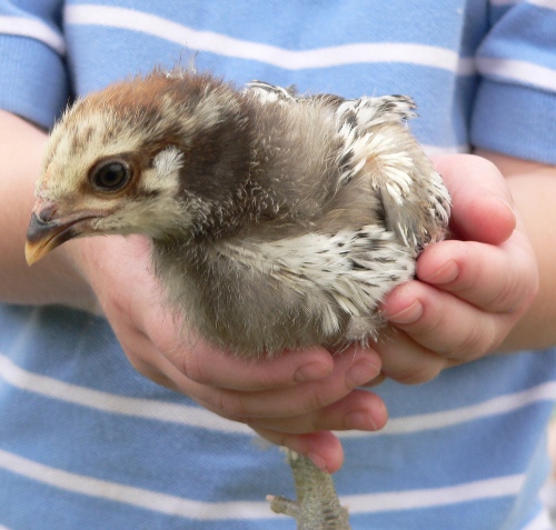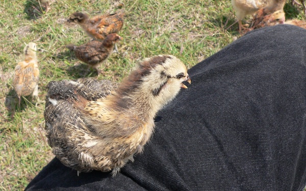 My two youngest children watched the chickens and kept them from venturing too far while my oldest son cleaned out the brooder and added fresh bedding. This Americana flew up onto my lap to perch as I sat in a folding chair taking photos.