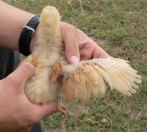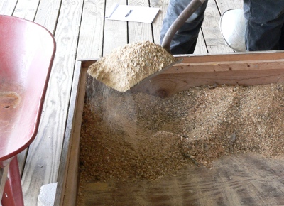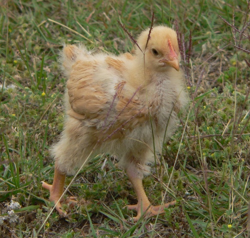 Today, we took all of the chicks out of the brooder and brought them out into the yard to let them forage while we replaced the bedding in their brooder. We’ve been using hardwood shavings, which are absorbent, easy on the chickens’ feet, and easy to remove and replace. We carted the old bedding out to the compost heap.