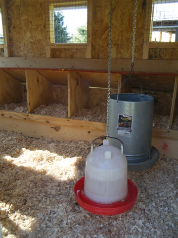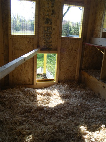 One side of the coop has a large door that lifts upwards for easy cleaning of the coop. It also has a side entrance door for easy access to the food and water. The roof and top of the attached nest box area are shingled. The many windows allow nice air flow through the coop.