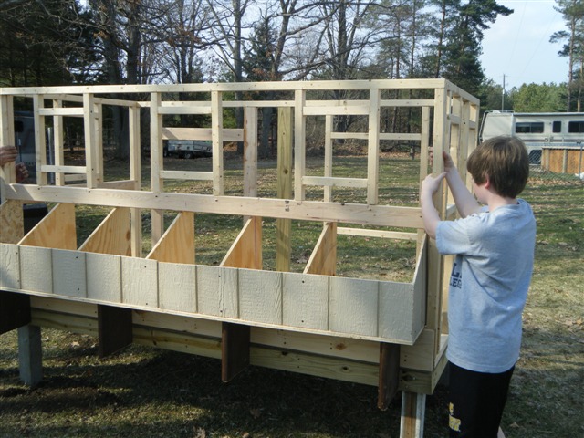 The attached nest boxes are 16″ high by 1 foot wide and 8 feet long for a total of 6 nest boxes. The frame of the house is made of 2 x 2’s. The outside run is 4 feet high, 16 feet long and 8 feet wide.