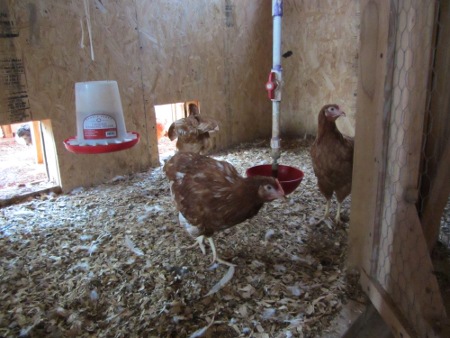 Inside the coop, Maria uses automatic water bowls. These together with feeders provide enough water and food for the chickens to go 3-4 days between refills.
