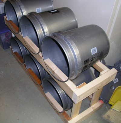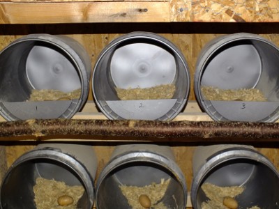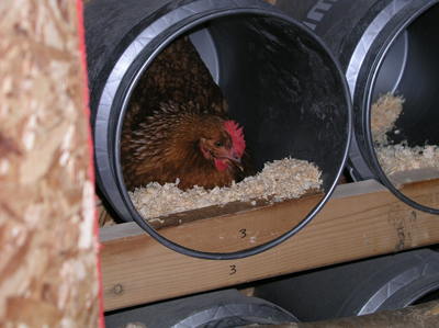 Greg used five gallon buckets for the nest boxes. He made a bracket that holds three buckets on top and three on bottom. He said that the hens love the nest boxes for laying, and the nest boxes are easy to remove for cleaning.