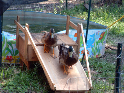 Our Rouens needed a larger pool as they grew, and the new one had 18″ high sides, making it impossible for them to get in. So, my husband constructed this little deck with duck ramp for them. It has the long ramp to the ground and a shorter one that rests on a concrete block inside the pool for them. They can easily and safely get in and out of the pool this way. We have kept this setup as our juvenile/hospital area now that they have a pond.