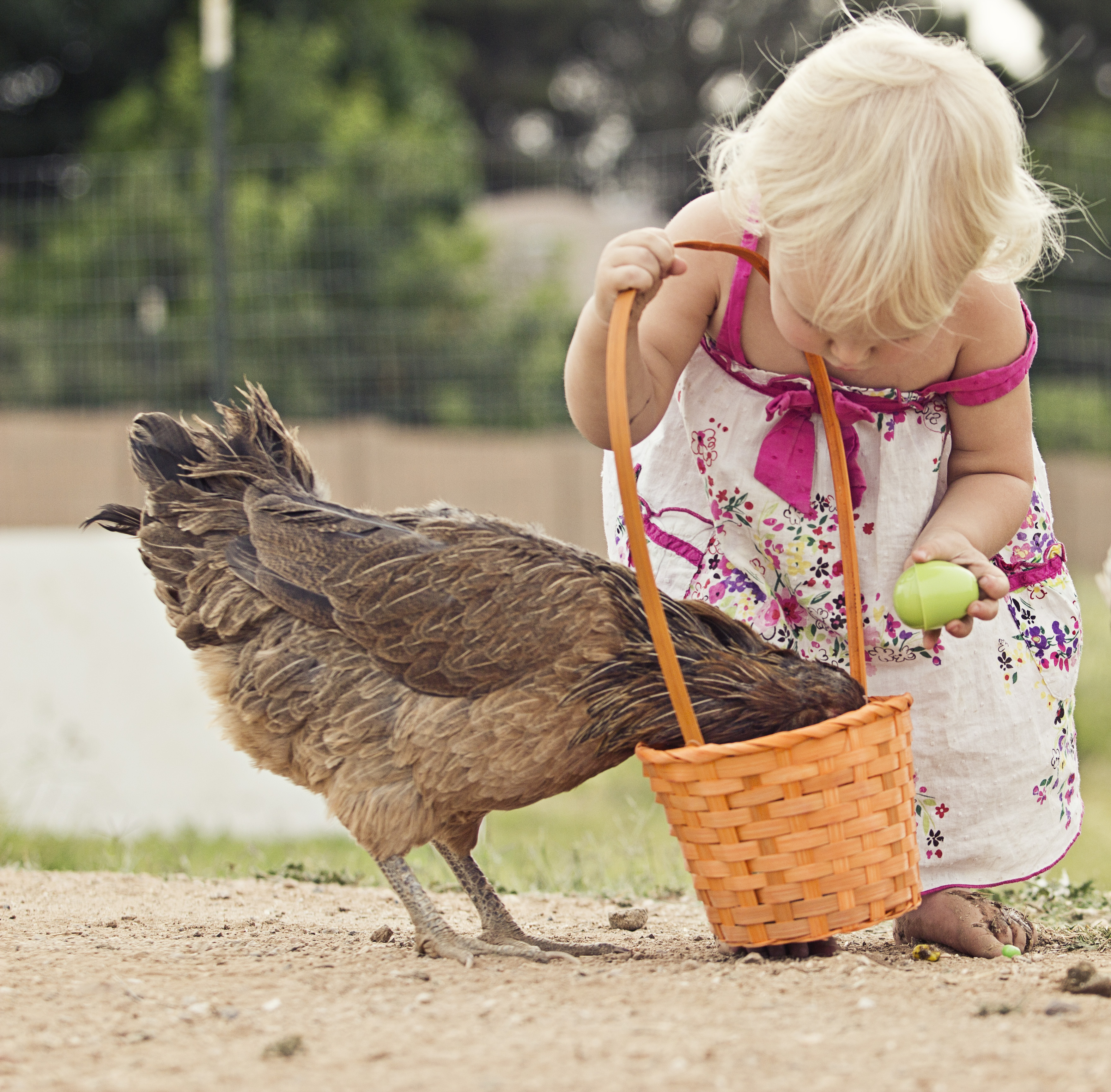 Awww! I love the picture of the little girl holding an Easter Egg and the chicken putting her head in the basket. Adorable!